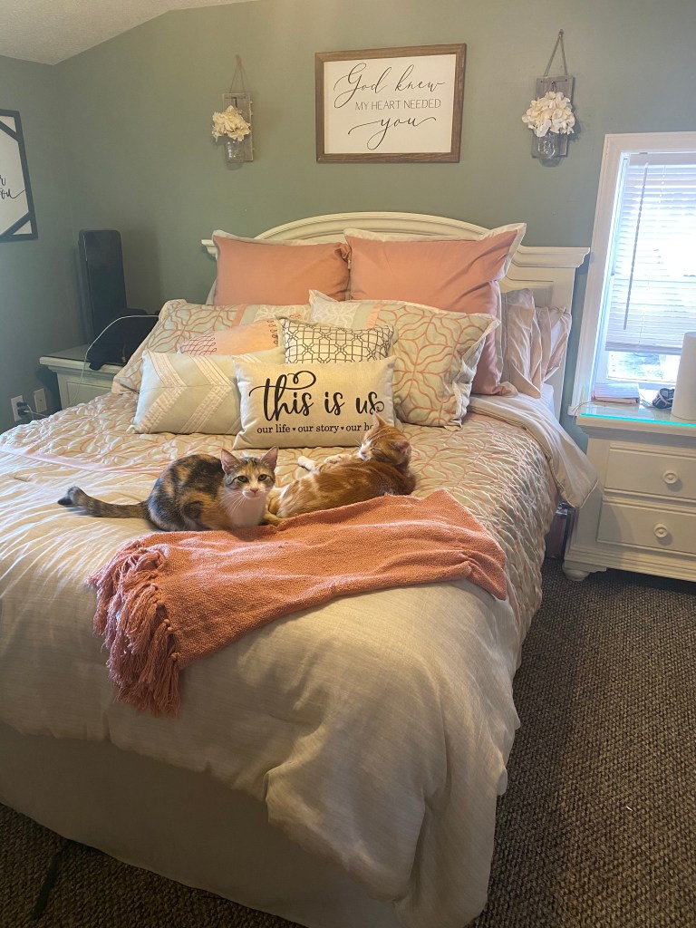 Happy Monday!!! I hope everyone had a fantastic weekend. Ours was pretty chill.. Donald got home from work late Friday evening, so we didn’t do much.. just played some MW. Saturday was basically the same. We streamed for a few hours.. ((if you wanna check us out, we’re live most days.. click here to watch some terrible gameplay with some semi-humorous commentary!!)) Sunday was kind of a busy day actually.. we went to my parent’s house to pick up a new bedroom set. Came home and replaced the old with the new. I am in love!!! Our bedding matches the new bedroom set perfectly!!