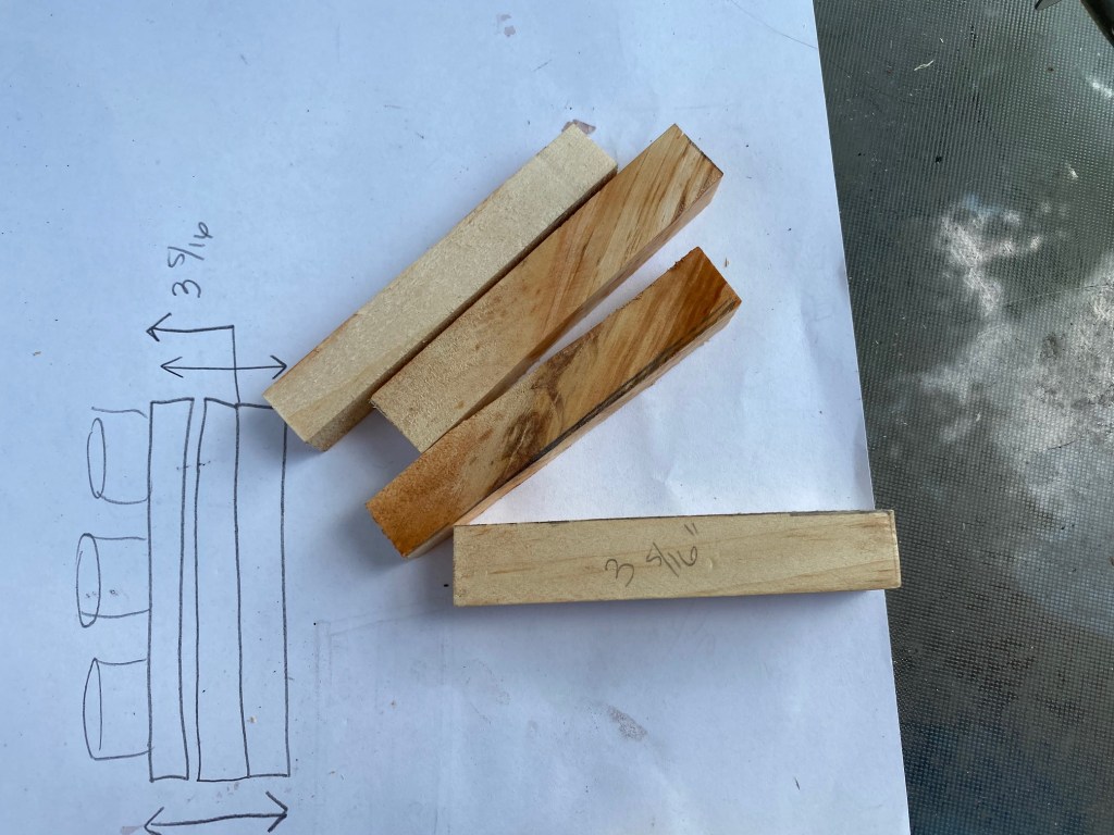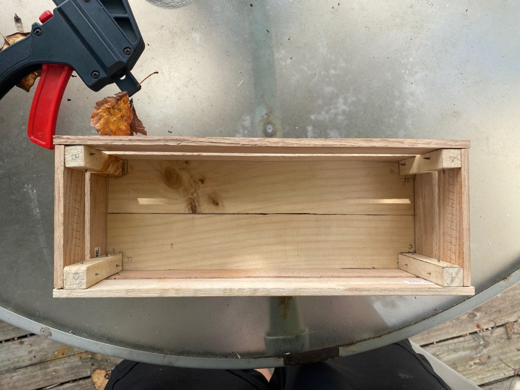 To make the inside corner pieces, Donald cut 1x1x3 5/16″ pieces from one of the boards we had.