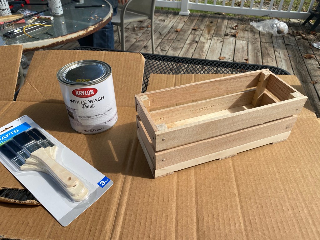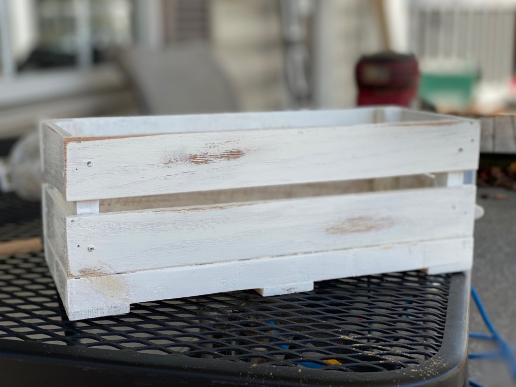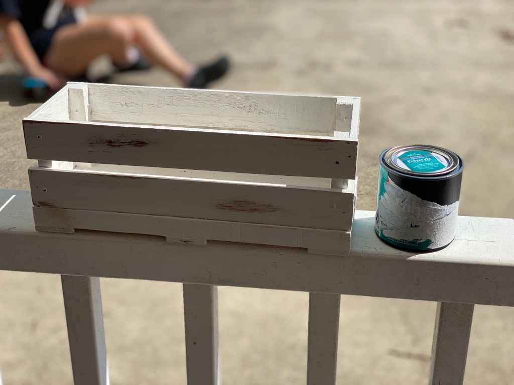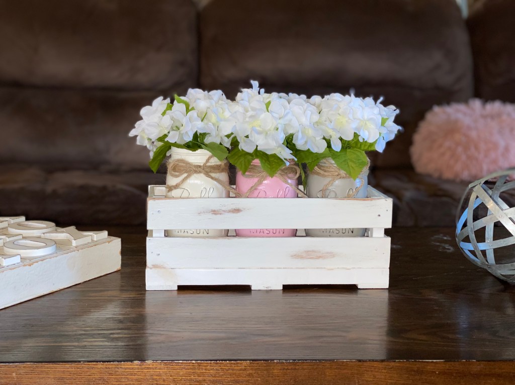 Also, like I said in my previous post (and above), at the end of this, the crate ended up being too small (that’s why I said to add an inch) to use with the large Mason jars that I had painted before. I ended up painting the smaller jars that I grabbed from my mom’s storage unit. They fit almost perfectly. So, personal preference, if you want to use the larger jars, make the crate a little bigger, if not, us the dimensions in this post. 😊