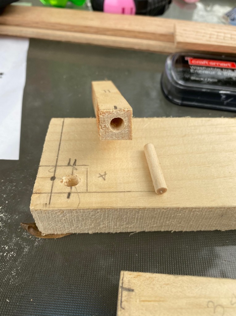 Then we screwed holes into the bottom of the corner pieces and into the base, and measured where they would be attached to the base. Donald also made dowels to make sure they would be secure.