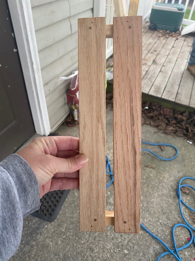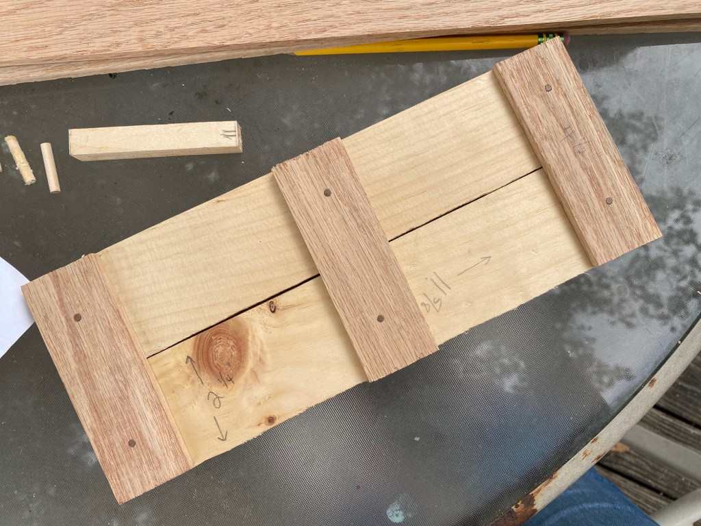 Because we used 1×3’s as the base, we didn’t have any way to attach the boards together ((you can use 1×6’s and you can skip this step)), so we cut small pieces of the trim board and attached them to the bottom of the 1×3’s.