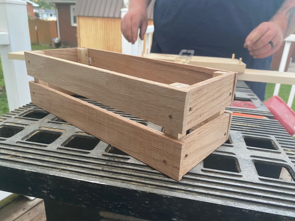 We decided that making the frame of the crate first would be easiest. So, we made the sides and connected them to each other and then attached it to the base.