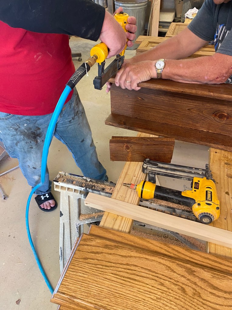 Now for the fun.. putting it together. Donald and I discussed options for how to put it together, and decided that using a Brad Nailer would probably be the most efficient way. Our landlord let us borrow his. He even helped some!