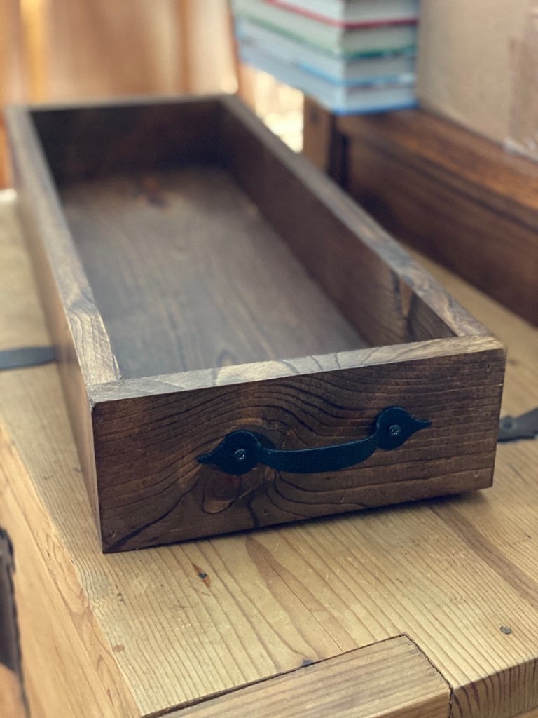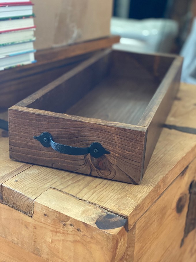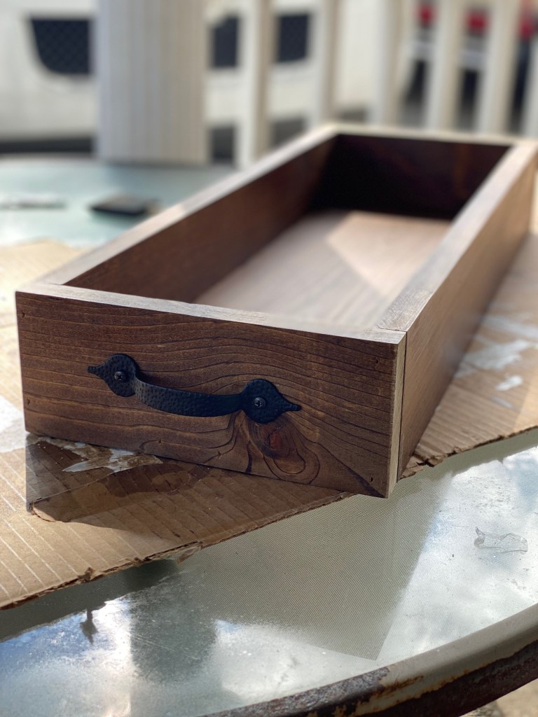 This was actually extremely simple to make, and it only cost me $5,00. My mom gave me a board the other day, and it just so happened to be perfect for what I needed. The only thing I had to buy for this was the drawer pulls. They were like $2.50 each or something. I had the stain and polycrylic already, so this was super easy and inexpensive.