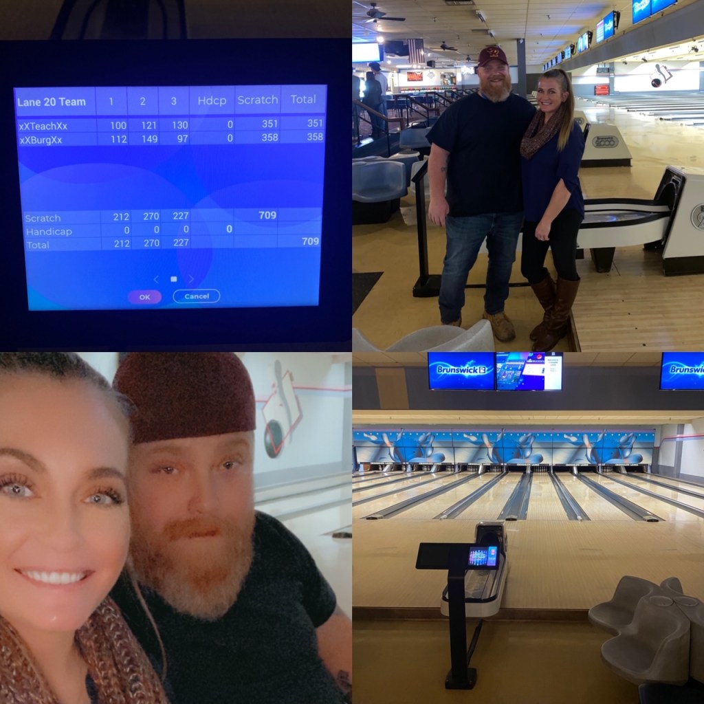 The next evening, we went bowling. We played three games.. Donald won the first two, and I won the third. I think he was over it after the second one (plus, his finger was hurting).