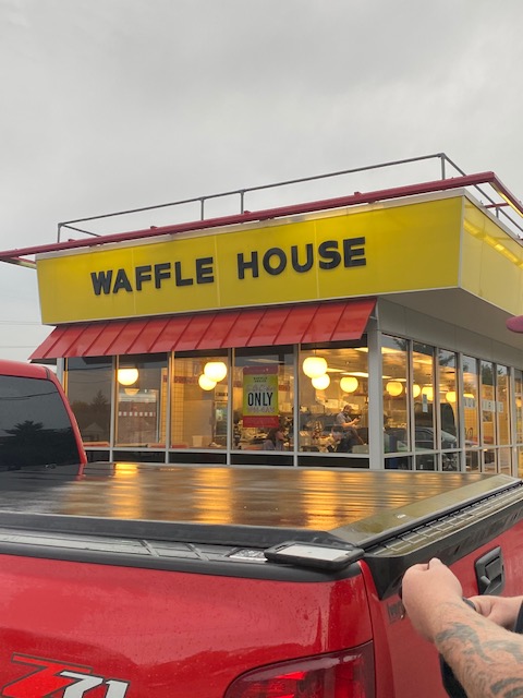 And, of course, we had to go to Waffle House for dinner. It was raining, so we didn’t walk this time. The booth that we sat in last time was blocked off because of Covid, so we sat in the one behind it. Close enough, I guess.
