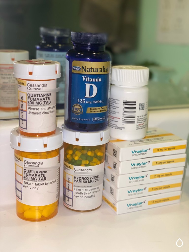 This is all of the meds that I have tried and failed. I have tried literally every medication that has come out for depression and anxiety: Lexapro, Trazadone, Buspar, Buspirone, Viibryd, Xanax, Valium, Trintellix, Effexor, Wellbutrin, Seroquel, and now Vraylar. Nothing has worked. I am also Vitamin D deficient, which is why I take that supplement.