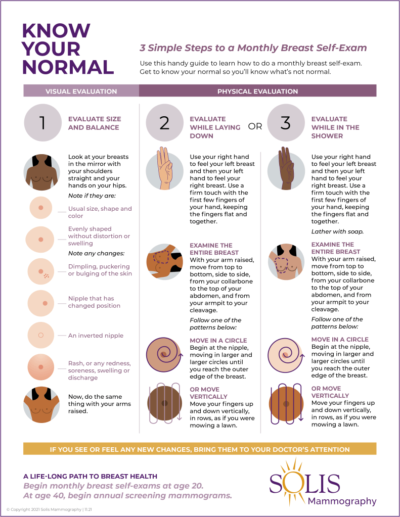 You should examine your breasts once a month. Know your “normal”. If anything looks or feels off, make an appointment with your doctor asap.