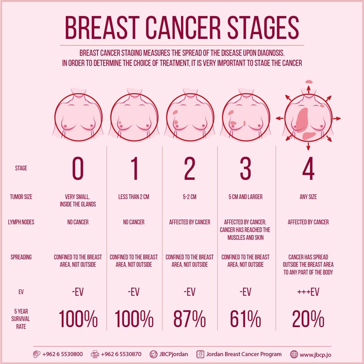 There are four stages with breast cancer. Stage I: Cancer is localized to a small area and hasn’t spread to lymph nodes or other tissues. Stage II: Cancer has grown, but it hasn’t spread. Stage III: Cancer has grown larger and has possibly spread to lymph nodes or other tissues. Stage IV: Cancer has spread to other organs or areas of your body.